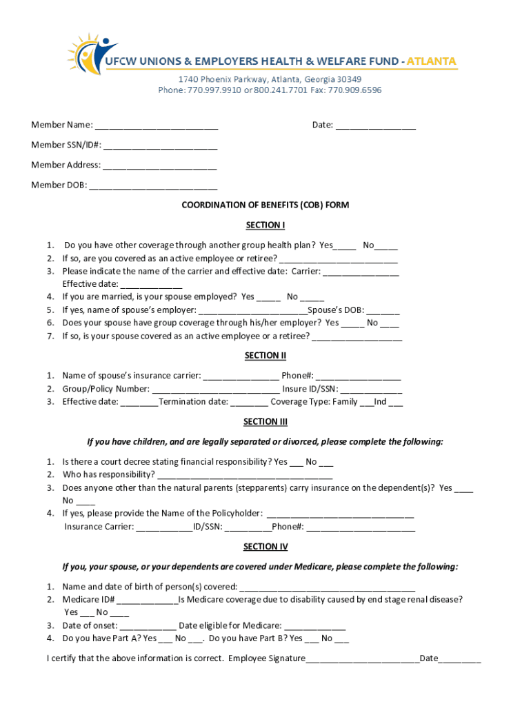 Member Name: ___Date: ___Member SSN/ID#: ___ Member Address: ___ Member DOB: ___ COORDINATION OF BENEFITS (COB) FORM SECTION I 1. Do you have other coverage through another group health plan? Yes___