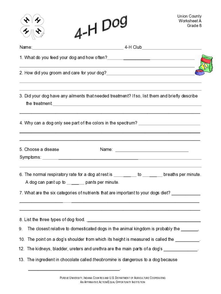 Union County Worksheet A Grade 8Name:4H Club1. What do you feed your dog and how often?___2. How did you groom and care for your dog?3. Did your dog have any ailments that needed treatment? If so,
