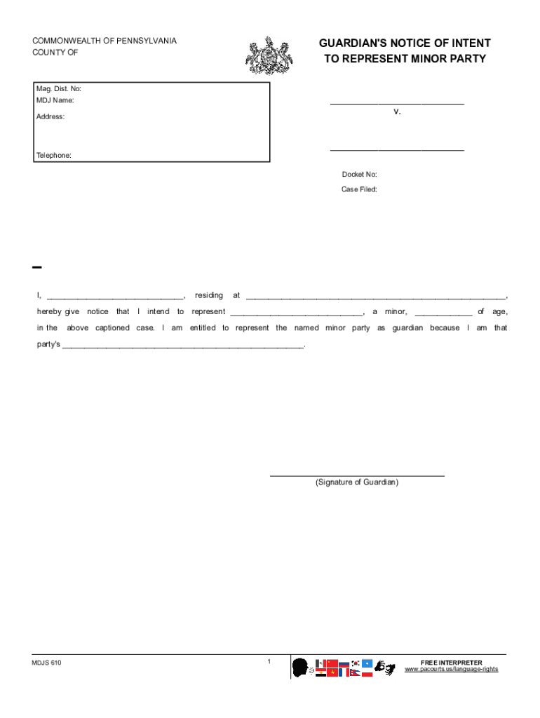 COMMONWEALTH OF PENNSYLVANIA COUNTY GUARDIAN\'S NOTICE OF INTENT TO REPRESENT MINOR Partying. Dist. No:___ v.MDJ Name: Address:___ Telephone: Docket No: Case Filed:I, ___, hereby give in thenoticethatIintendtoresidingat