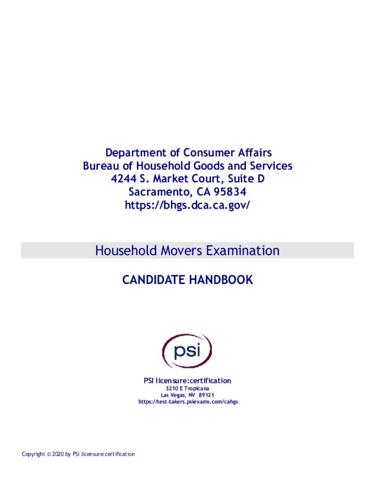 Department of Consumer Affairs Bureau of Household Goods and Services 4244 S. Market Court, Suite D Sacramento, CA 95834 https://bhgs.dca.ca.gov/Household Movers Examination CANDIDATE HANDBOOKS licensure:certification