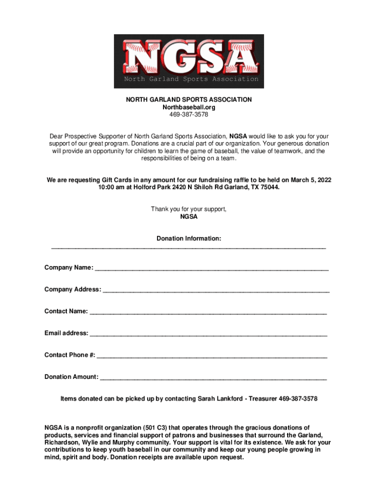 NORTH GARLAND SPORTS ASSOCIATION North baseball.org 4693873578Dear Prospective Supporter of North Garland Sports Association, NASA would like to ask you for your support of our great program. Donations