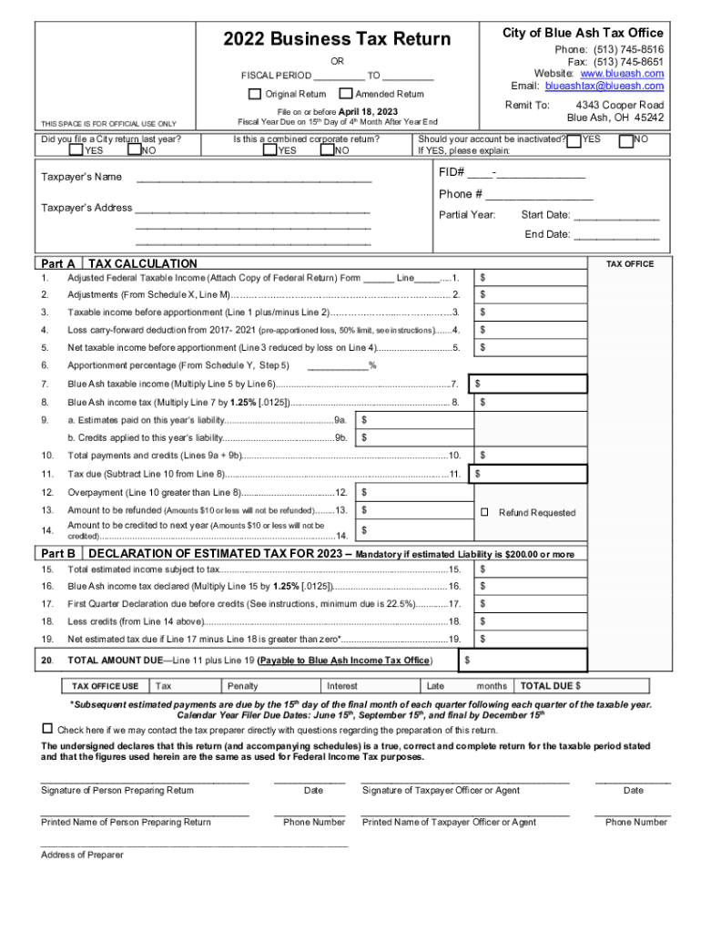 City of Blue Ash Tax Office2022 Business Tax ReturnPhone: (513) 7458516 Fax: (513) 7458651 Website: www.blueash.com Email: blueashtax@blueash.comOR FISCAL PERIOD ___ TO ___ Original Return THIS SPACE