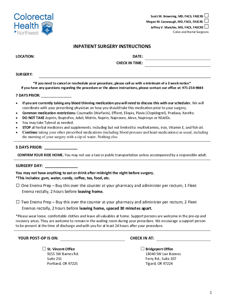 Scott M. Browning, MD, FACS, FA SCRS Megan M. Kavanaugh, MD, FACS, FASCRSJeffrey V. Manchu, MD, FACS, FA SCRS Colon and Rectal SurgeonsINPATIENT SURGERY INSTRUCTIONS LOCATION:DATE: CHECK IN TIME:SURGERY: