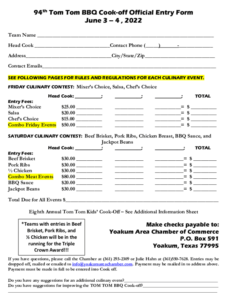 94th Tom BBQ Cook off Official Entry Form June 3 4, 2022 Team Name ___ Head Cook ___Contact Phone (___)___Address___City/State/Zip___ Contact Emails___ SEE FOLLOWING PAGES FOR RULES AND REGULATIONS
