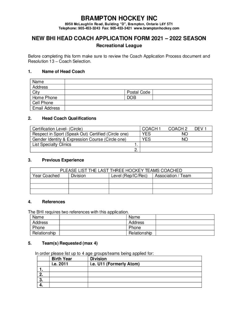 BRAMPTON HOCKEY INC 8950 McLaughlin Road, Building D, Brampton, Ontario L6Y 5T1 Telephone: 9054533243 Fax: 9054533421 www.bramptonhockey.comNEW BHI HEAD COACH APPLICATION FORM 2021 2022 SEASON Recreational