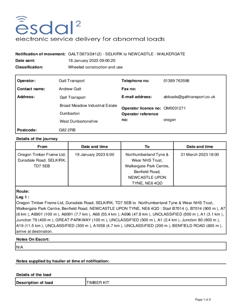 Notification of movement: SALT/3873/2#1(2) SELKIRK to NEWCASTLE WATERGATE Date sent:18 January 2023 09:00:20Classification:Wheeled construction and operator:Salt TransportTelephone no:Contact name:Andrew