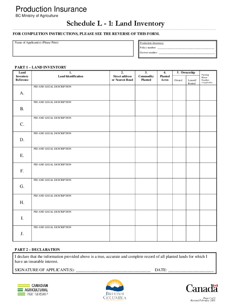 BC Ministry of AgricultureSchedule L 1: Land Inventory___FOR COMPLETION INSTRUCTIONS, PLEASE SEE THE REVERSE OF THIS FORM.