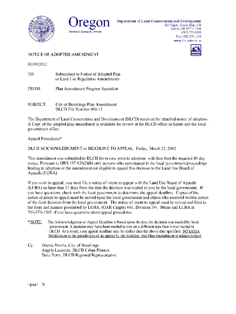 Department of Land Conservation and Development 635 Capitol Street, Suite 150 Salem, O R 9730 12540 (503) 3730050 Fax (503) 3785518 w w w. LC d. s that e. or. notice OF ADOPTED AMENDMENT/Bra03/09/2012