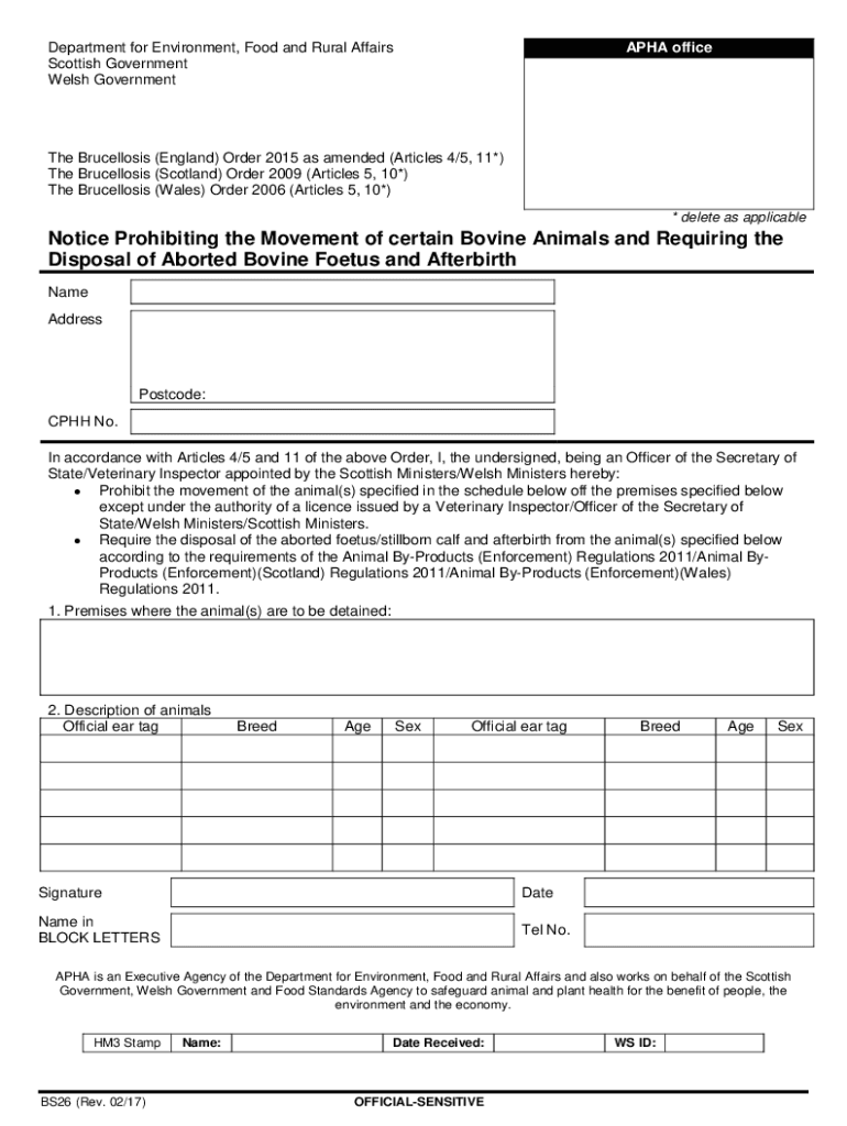 Department for Environment, Food and Rural Affairs Scottish Government Welsh Governmental office Brucellosis (England) Order 2015 as amended (Articles 4/5, 11*) The Brucellosis (Scotland) Order 2009
