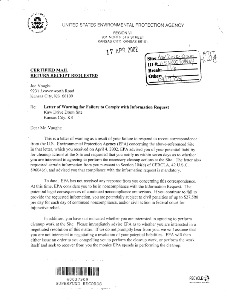 UNITED STATES ENVIRONMENTAL PROTECTION AGENCY l Pnn^feCREGION VII 901 NORTH 5TH STREET KANSAS CITY, KANSAS 661011×1 APR 2002 CERTIFIED MAIL RETURN RECEIPT REQUESTED Joe Vaught 9231 Leavenworth Road