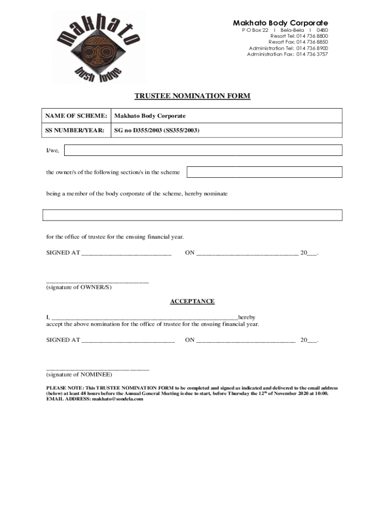 Mankato Body Corporate P O Box 22I Bela I 0480 Resort Tells: 014 736 8800 Resort Fax; 014 736 8850 Administration Tel: 014 736 8900 Administration Fax: 014 736 3757TRUSTEE NOMINATION FORM NAME OF