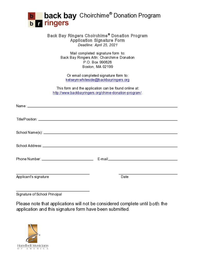 Choir chime Donation Program Back Bay Ringers Choir chime Donation Program Application Signature Form Deadline: April 25, 2021Mail completed signature form to: Back Bay Ringers Attn: Choir chime Donation