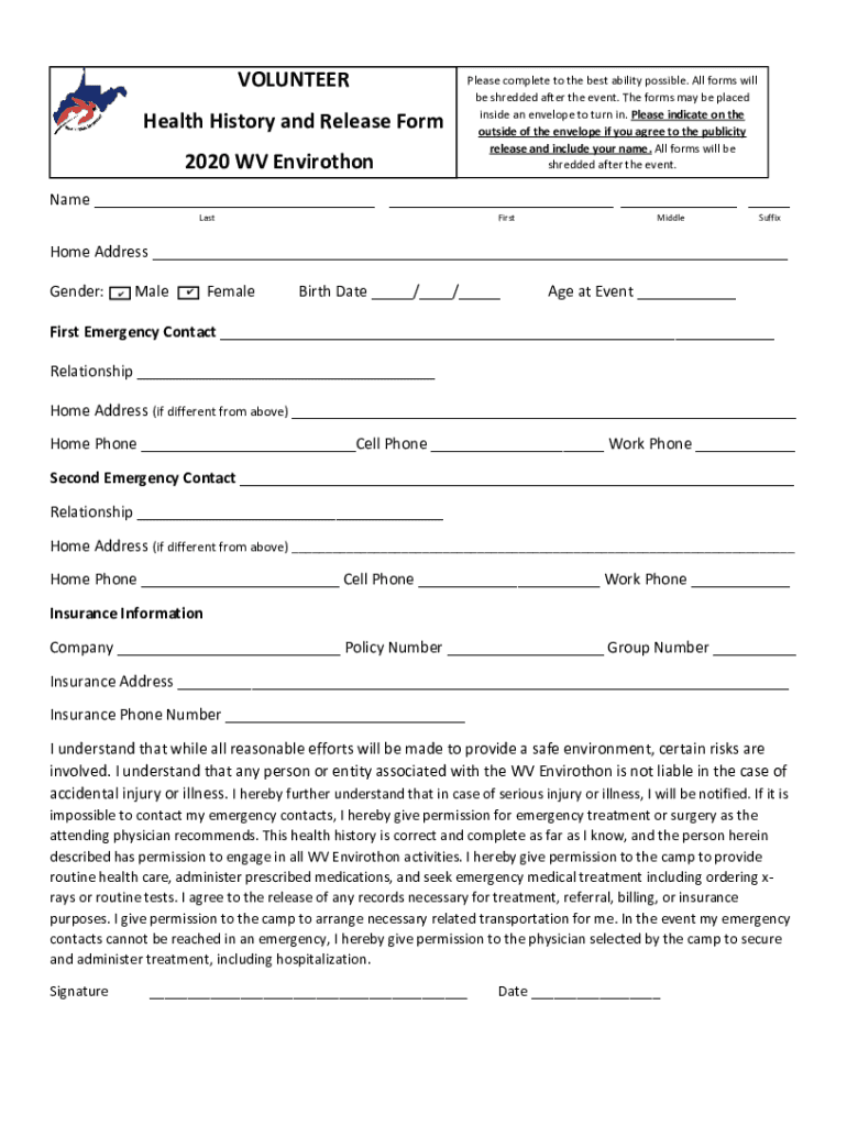 VOLUNTEER Health History and Release Form 2020 WV EnvirothonPlease complete to the best ability possible. All forms will be shredded after the event. The forms may be placed inside an envelope to
