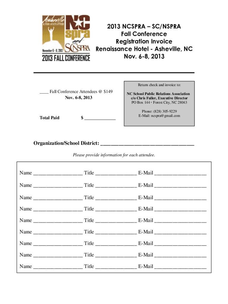 2013 NCS PRA SC/NS PRA Fall Conference Registration Invoice Renaissance Hotel Asheville, NC Nov. 68, 2013Return check and invoice to:___ Fall Conference Attendees @ $149 Nov. 68, 2013Total Paid ___NC