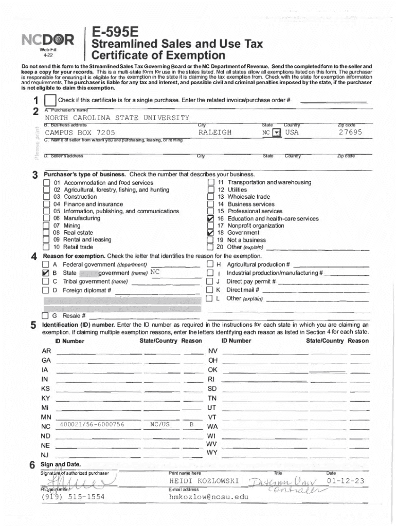CDR Weill 422E595EStreamlined Sales and Use Tax Certificate of Exemption not send this form to the Streamlined Sales Tax Governing Board or the NC Department of Revenue. Send the completed form to