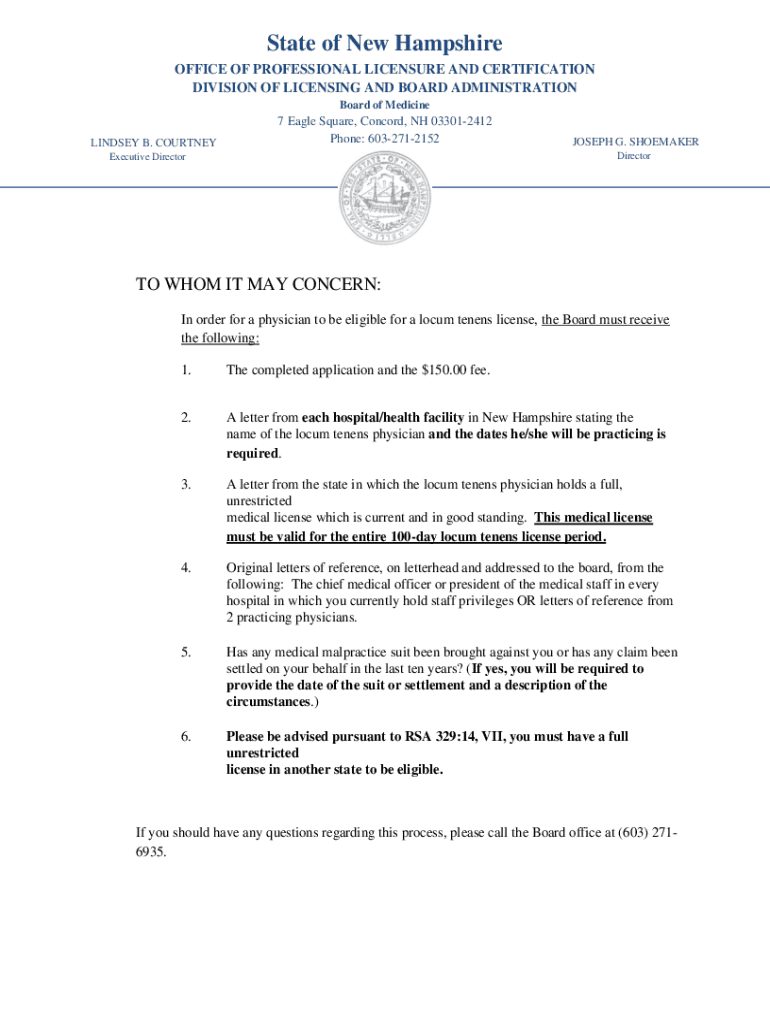 State of New Hampshire OFFICE OF PROFESSIONAL LICENSURE AND CERTIFICATION DIVISION OF LICENSING AND BOARD ADMINISTRATION Board of Medicine LINDSEY B. COURTNEY7 Eagle Square, Concord, NH 033012412
