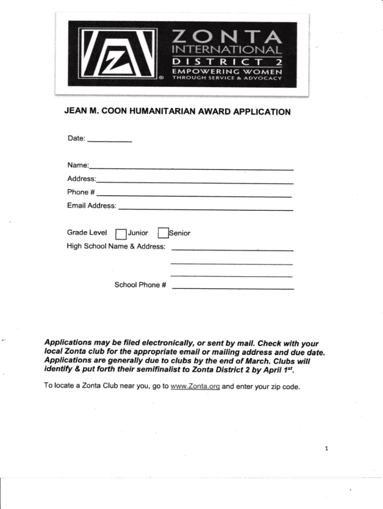 ZO N T A INTERNATIONAL Pt S T R i CT EMPOWERING 2WOMENT H R O U G H SERVICE & A D V O C A CY JEAN M. COON HUMANITARIAN AWARD APPLICATION Date:Name: Address: Phone# Email Address:Grade LevelJuniorSeniorHigh