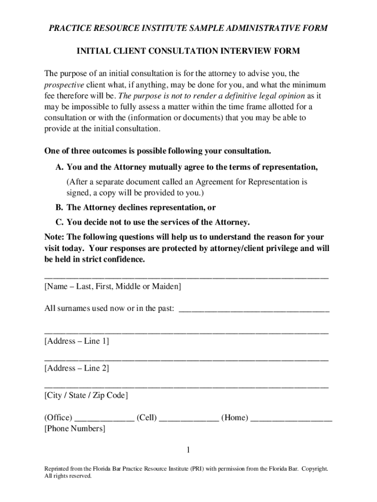 PRACTICE RESOURCE INSTITUTE SAMPLE ADMINISTRATIVE FORM INITIAL CLIENT CONSULTATION INTERVIEW From The purpose of an initial consultation is for the attorney to advise you, the prospective client what,