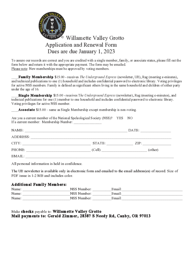 Willamette Valley Grotto Application and Renewal Form Dues are due January 1, 2023, To assure our records are correct, and you are credited with a single member, family, or associate status, please