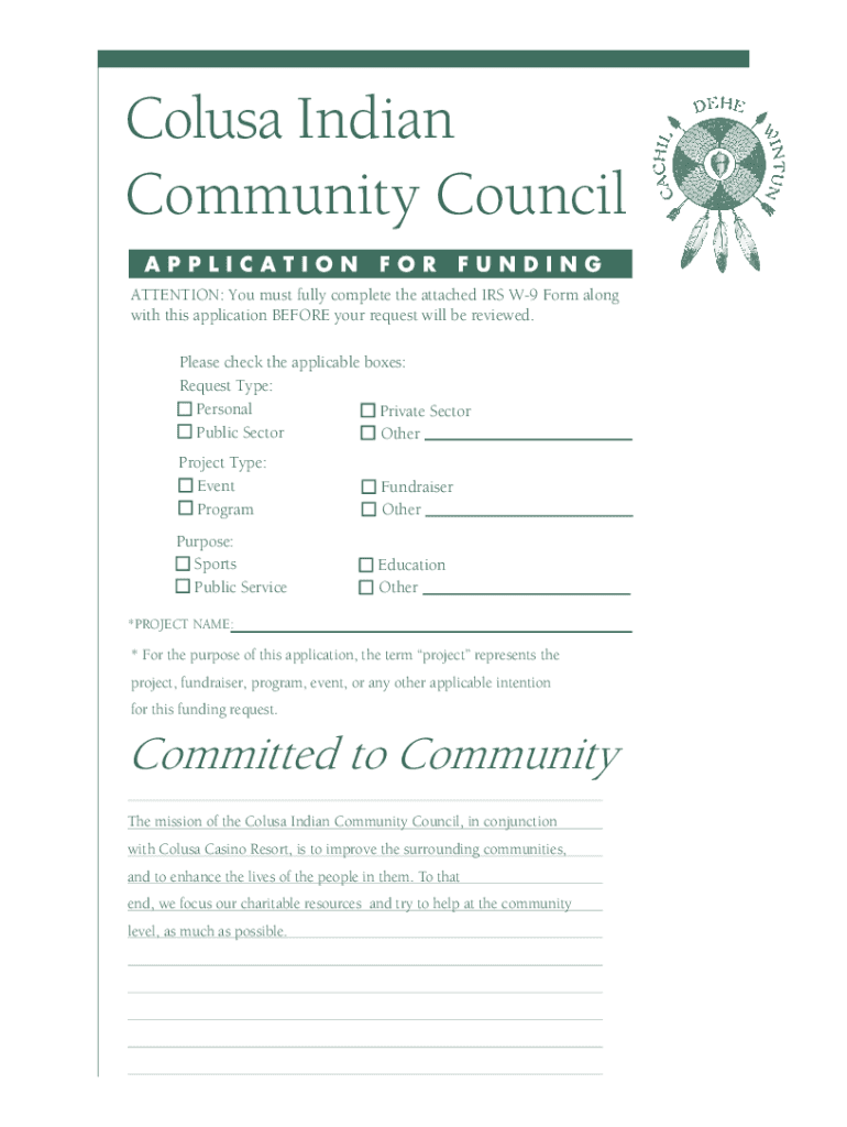 Column Indian Community Council ATTENTION: You must fully complete the attached IRS W9 Form along with this application BEFORE your request will be reviewed. Please check the applicable boxes: Request
