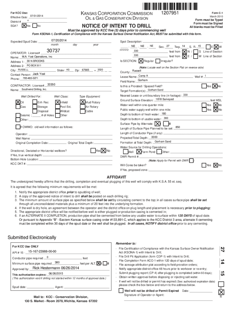 07/01/2014Effective Date: SGA? Perform C1 March 2010OIL & GAS CONSERVATION DIVISION4District #1207951KANSAS CORPORATION Commissioner KCC Use:Form must be Typed Form must be Signed All blanks must