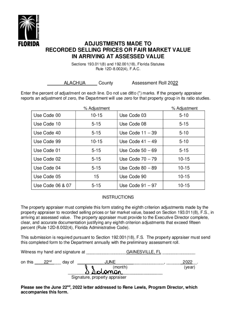 ADJUSTMENTS MADE TO RECORDED SELLING PRICES OR FAIR MARKET VALUE IN ARRIVING AT ASSESSED VALUE Sections 193.011(8) and 192.001(18), Florida Statutes Rule 12D8.002(4), F.A.C.ALACHUACountyAssessment