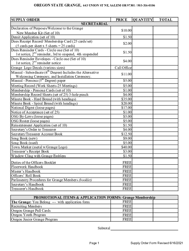 OREGON STATE GRANGE, 643 UNION ST NE, SALEM OR 97301 / 5033160106 SUPPLY ORDERSECRETARIAL Declaration of Purposes/Welcome to the Grange New Member Kit (Set of 10) Debit Application (set of 10) Dues
