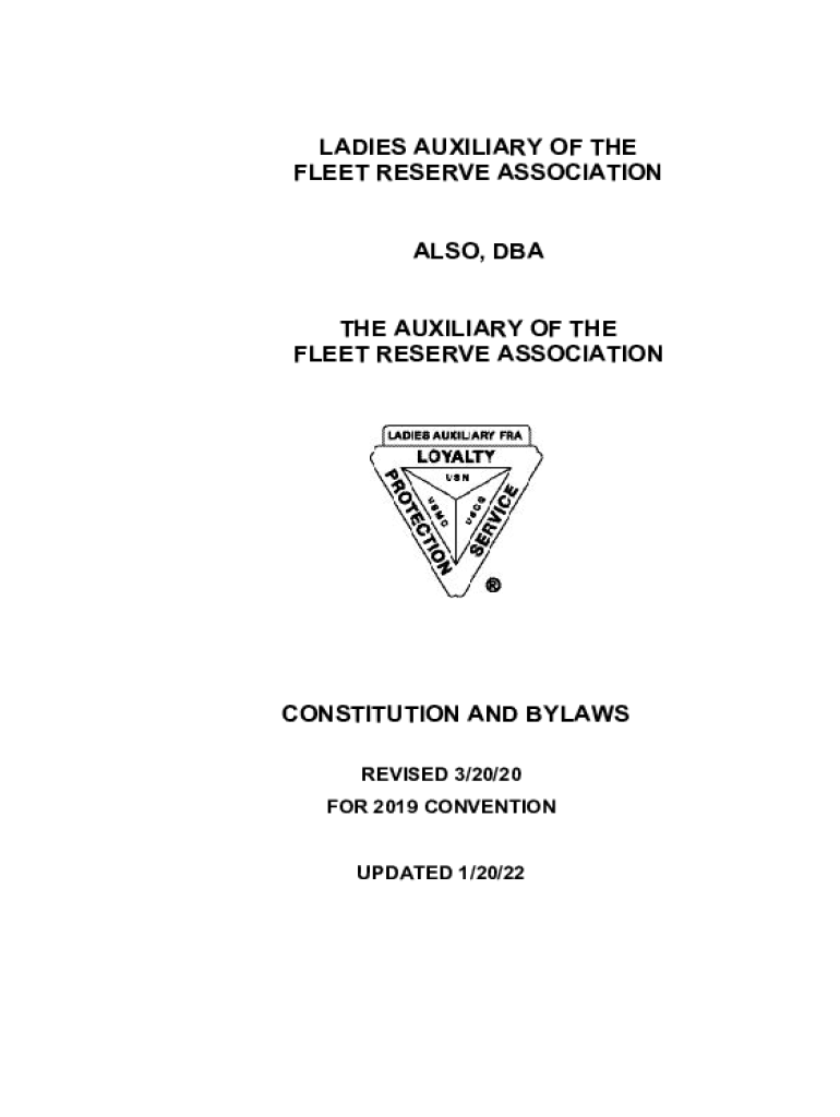 LADIES AUXILIARY OF THE FLEET RESERVE ASSOCIATION ALSO, DBA THE AUXILIARY OF THE FLEET RESERVE ASSOCIATIONCONSTITUTION AND BYLAWS REVISED 3/20/20 FOR 2019 CONVENTION UPDATED 1/20/22biTABLE OF CONTENTS