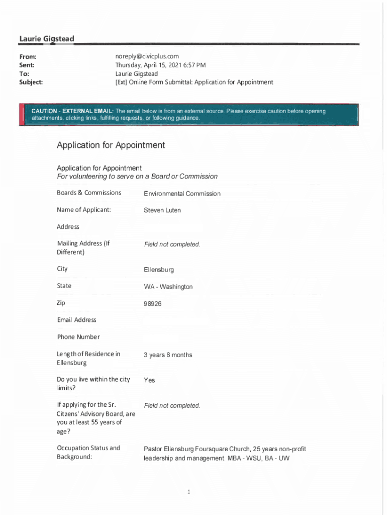 Laurie Gig stead noreply@civicplus.com Thursday, April 15, 2021 6:57 PM Laurie Gig stead [Ext] Online Form Submittal: Application for AppointmentFrom:Sent: To:Subject: !CAUTION EXTERNAL EMAIL: The