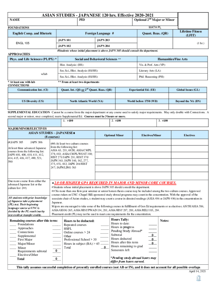 ASIAN STUDIES JAPANESE 120 hrs. Effective 20202021 NAMEOptional 2nd Major or MinorPIDMATH PLFOUNDATIONSForeign Language #English Comp. And Rhetoric JAPAN 101JAPN 203JAPN 102JAPN 204Lifetime Fitness