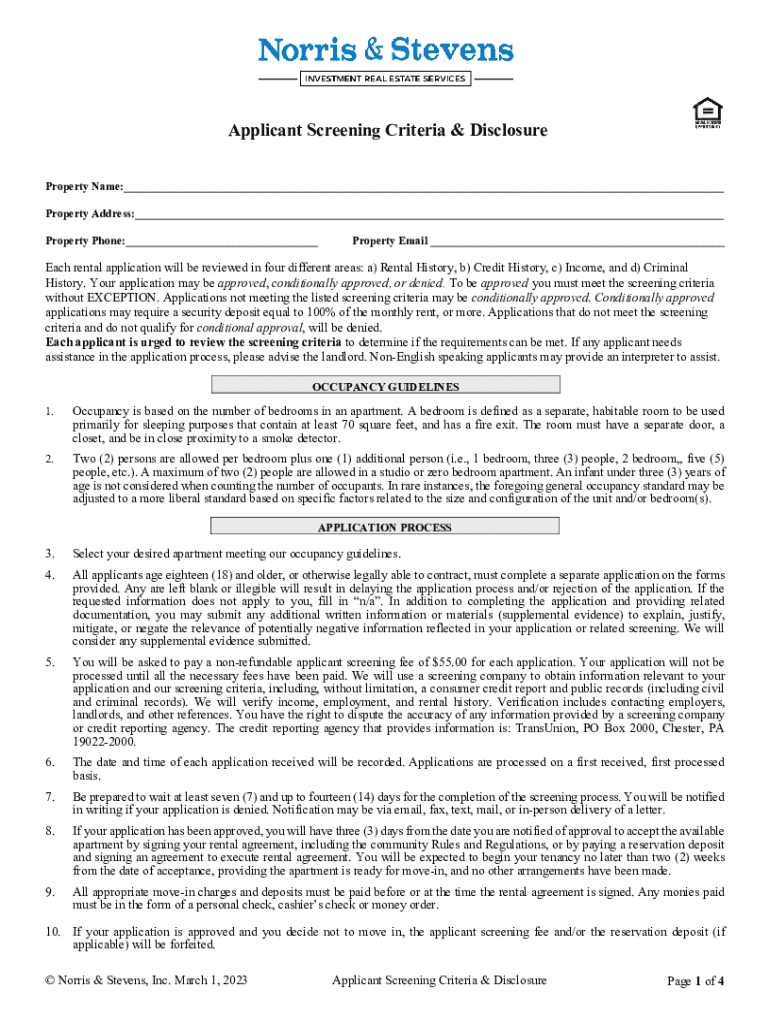 Clear FormApplicant Screening Criteria & Disclosure Property Name:___ Property Address:___ Property Phone:___Property Email ___Each rental application will be reviewed in four different areas: a)