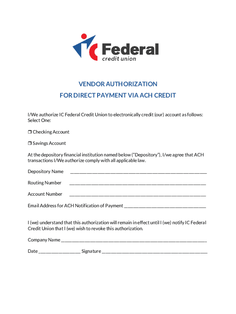 VENDOR AUTHORIZATION FOR DIRECT PAYMENT VIA ACH CREDIT I/We authorize IC Federal Credit Union to electronically credit (our) account as follows: Select One: Checking Account Savings Account At the