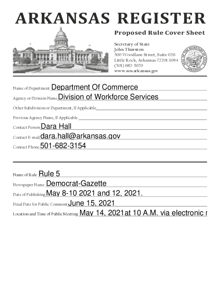 ARKANSASREGISTERProposed Rule Cover Sheet Secretary of State John Thurston 500 Woodland Street, Suite 026 Little Rock, Arkansas 722011094 (501) 6825070 www.sos.arkansas.govDepartment Of Commerce Agency