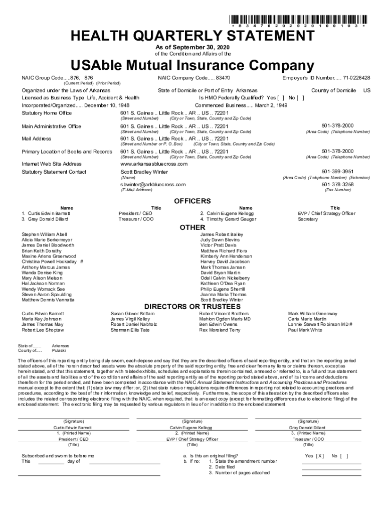 *83470202020100103×HEALTH QUARTERLY STATEMENT As of September 30, 2020, of the Condition and Affairs of reusable Mutual Insurance Company NAIL Group Code.....876, 876NAIC Company Code..... 83470Employer\'s
