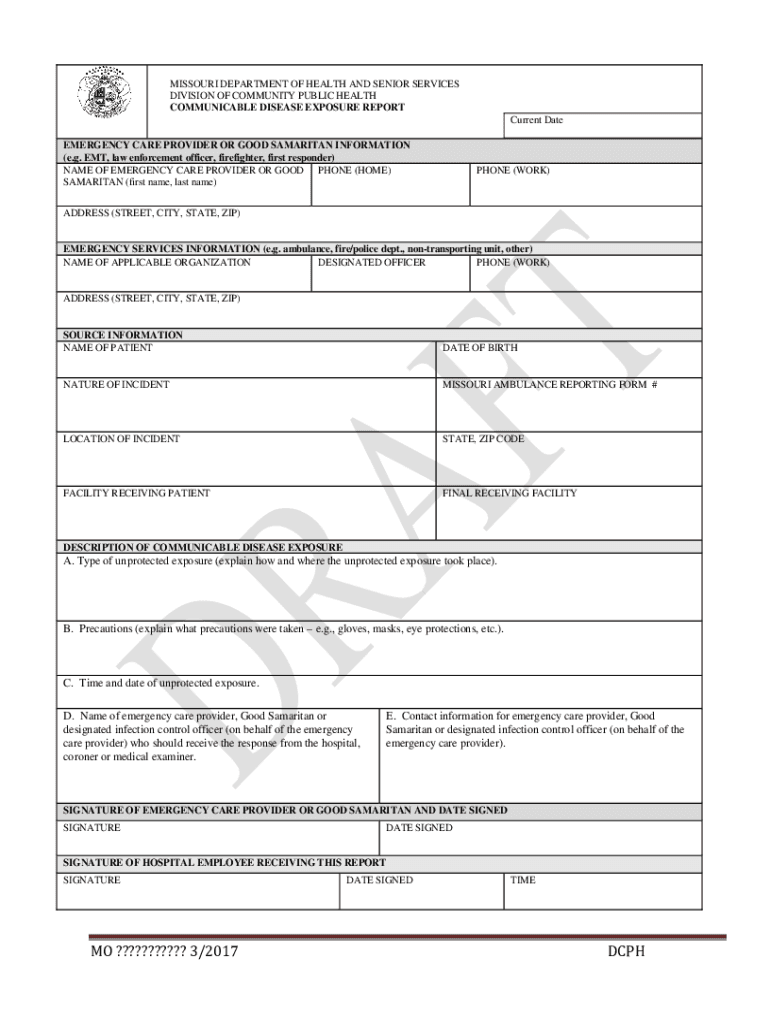 MISSOURI DEPARTMENT OF HEALTH AND SENIOR SERVICES DIVISION OF COMMUNITY PUBLIC HEALTH COMMUNICABLE DISEASE EXPOSURE REPORT Current Date EMERGENCY CARE PROVIDER OR GOOD SAMARITAN INFORMATION (e.g.