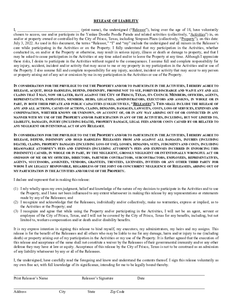 RELEASE OF LIABILITY I, ___ (print name), the undersigned (Releaser), being over the age of 18, have voluntarily chosen to access, use and/or participate in the Yankee Doodle Poodle Parade and related