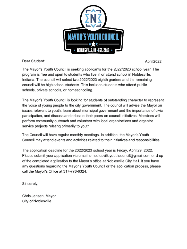 Dear Student:April 2022The Mayors Youth Council is seeking applicants for the 2022/2023 school year. The program is free and open to students who live in or attend school in Noblesville, Indiana.