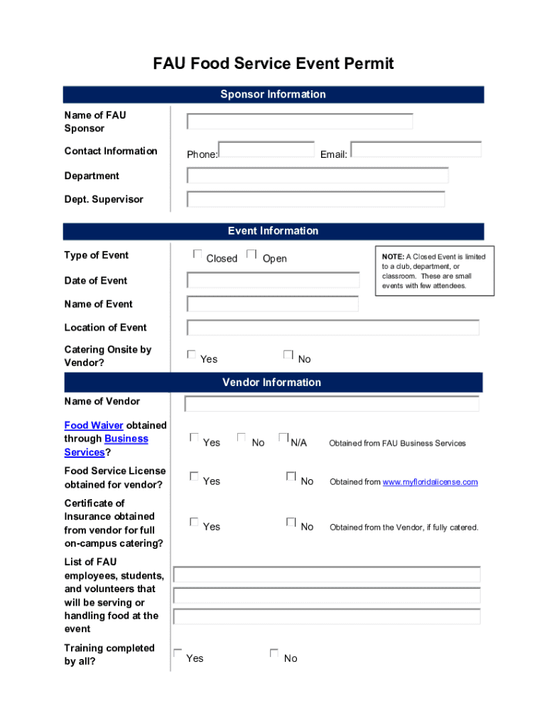FAR Food Service Event Permit Sponsor Information Name of FAR Sponsor Contact InformationPhone:Email:Department Dept. SupervisorEvent Information Type of EventClosedNOTE: A Closed Event is limited