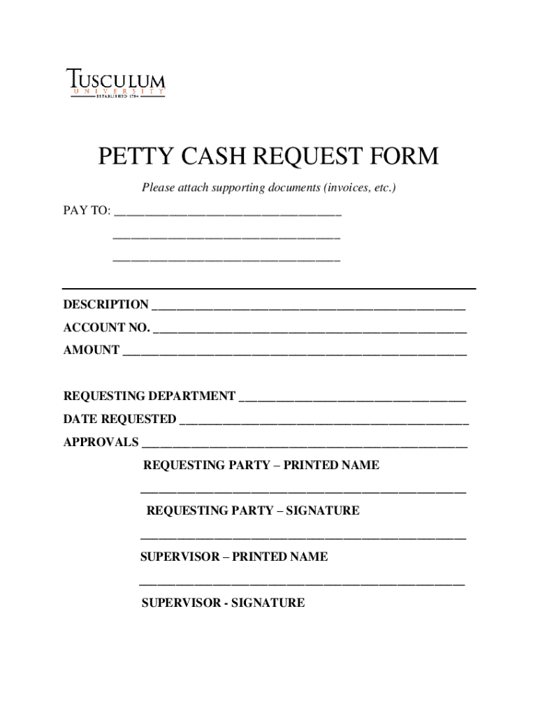 PETTY CASH REQUEST FORM Please attach supporting documents (invoices, etc.) PAY TO: ___ ___ ___DESCRIPTION ___ ACCOUNT NO. ___ AMOUNT ___REQUESTING DEPARTMENT ___ DATE REQUESTED ___ APPROVALS ___