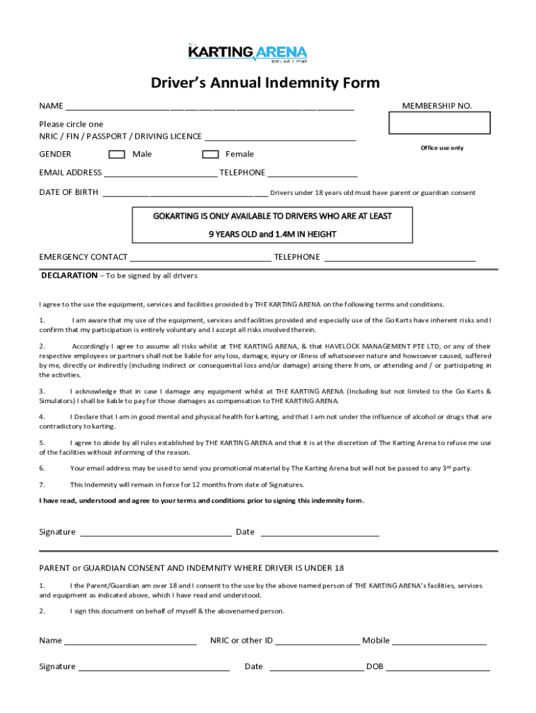 Drivers Annual Indemnity Form NAME ___MEMBERSHIP NO. Please circle one ERIC / FIN / PASSPORT / DRIVING License ___ GENDERMaleFemaleOffice use onlyEMAIL ADDRESS ___ TELEPHONE ___ DATE OF BIRTH ___