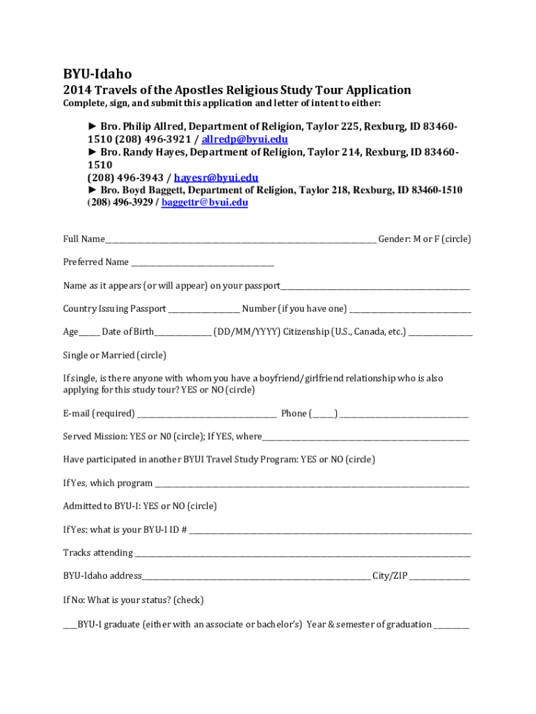 BYUIdaho2014 Travels of the Apostles Religious Study Tour Application Complete, sign, and submit this application and letter of intent to either: Bro. Philip Allied, Department of Religion, Taylor