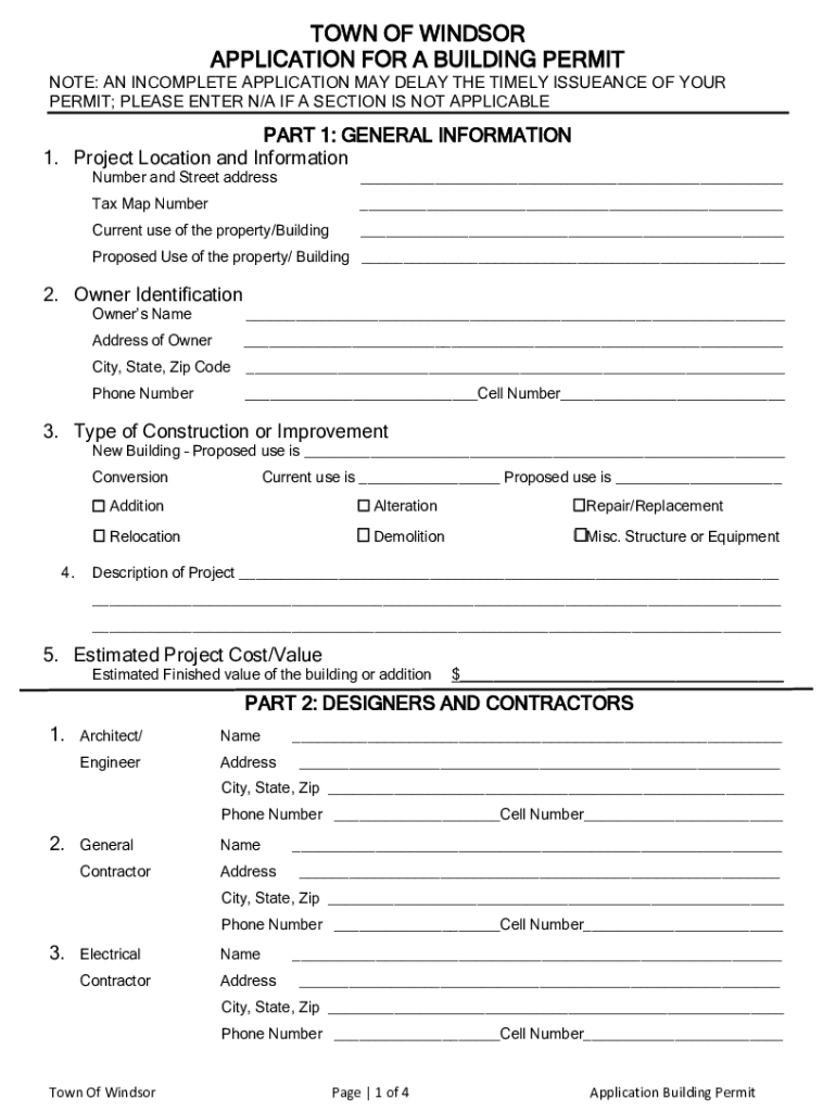TOWN OF WINDSOR APPLICATION FOR A BUILDING PERMIT NOTE: AN INCOMPLETE APPLICATION MAY DELAY THE TIMELY ISSUANCE OF YOUR PERMIT; PLEASE ENTER N/A IF A SECTION IS NOT APPLICABLEPART 1: GENERAL INFORMATION