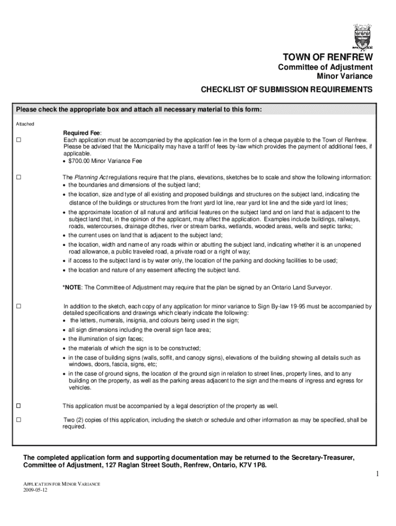 TOWN OF RENFREW Committee of Adjustment Minor Variance CHECKLIST OF SUBMISSION REQUIREMENTS Please check the appropriate box and attach all necessary material to this form: AttachedRequired Fee: Each