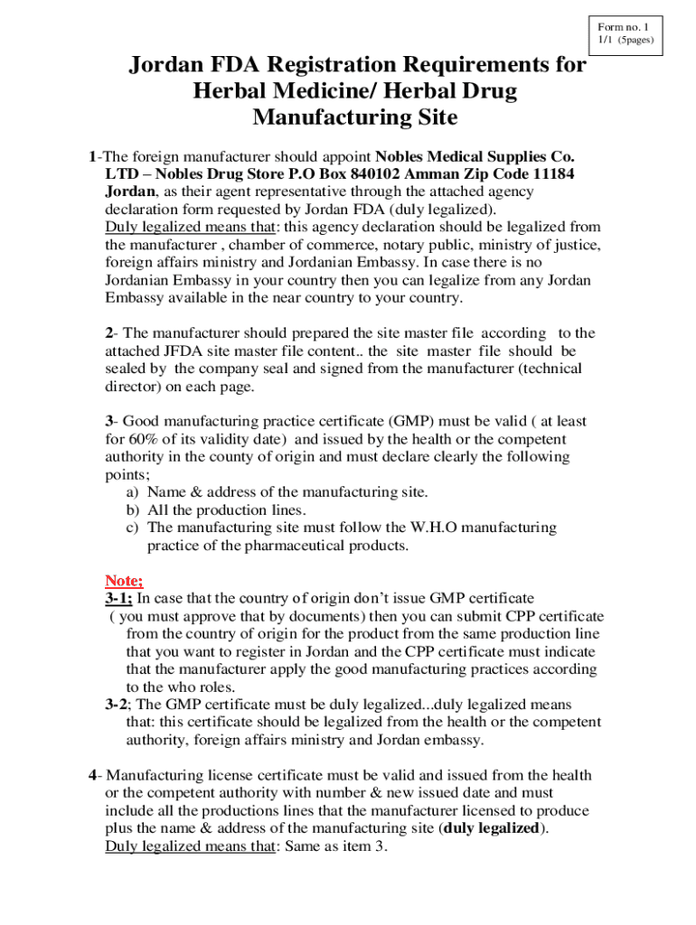 Form no. 1 1/1 (5pages)Jordan FDA Registration Requirements for Herbal Medicine/ Herbal Drug Manufacturing Site 1The foreign manufacturer should appoint Nobles Medical Supplies Co. LTD Nobles Drug