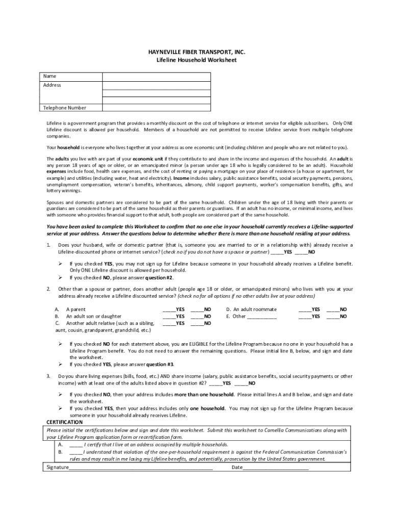 HAYESVILLE FIBER TRANSPORT, INC. Lifeline Household WorksheetNameAddressTelephone NumberLifeline is a government program that provides a monthly discount on the cost of telephone or internet service for eligible subscribers.