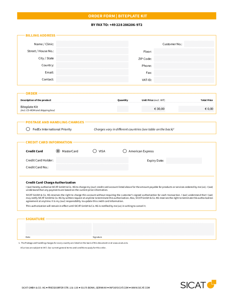 ORDER FORM | BASEPLATE KIT BY FAX TO: +49 228 286206972 BILLING ADDRESS Name / Clinic:Customer No.:Street / House No.:Floor:City / State ZIP Code:Country:Phone:Email:Fax:Contact:VALID:ORDER Description