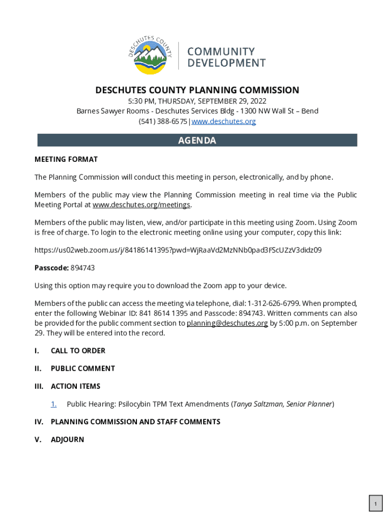 DESCARTES COUNTY PLANNING COMMISSION 5:30 PM, THURSDAY, SEPTEMBER 29, 2022, Barnes Sawyer Rooms Descartes Services Bldg 1300 NW Wall St Bend (541) 3886575|www.deschutes.orgAGENDA MEETING FORMAT The
