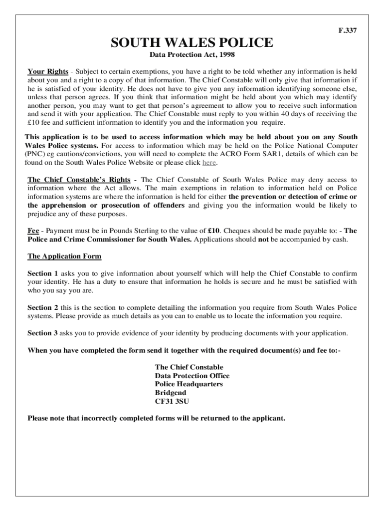 Get the free Subject Access application form (25.24 kB) - South Wales Police