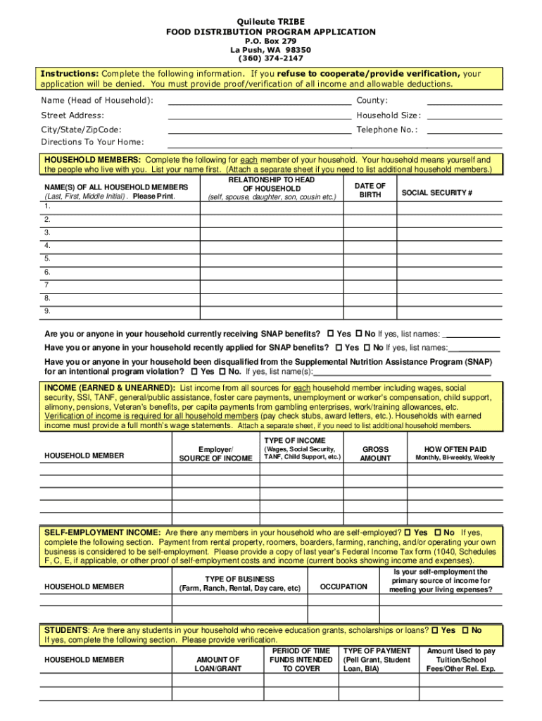 Quilpué TRIBE FOOD DISTRIBUTION PROGRAM APPLICATION P.O. Box 279 La Push, WA 98350 (360) 3742147Instructions: Complete the following information. If you refuse to cooperate/provide verification,