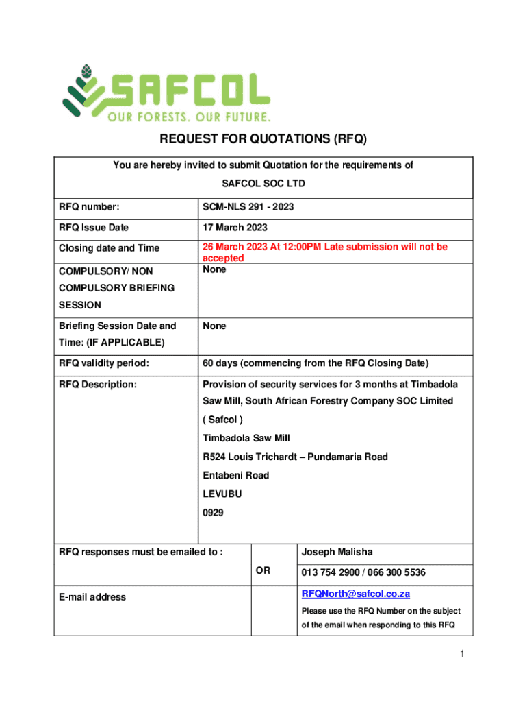 REQUEST FOR QUOTATIONS (RFQ) You are hereby invited to submit Quotation for the requirements of SAF COL SOC LTD RFQ number:SCM NLS 291 2023RFQ Issue Date17 March 2023Closing date and Time26 March